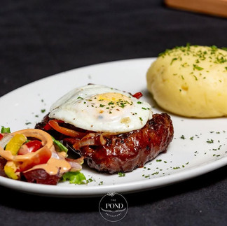 The Pond offers different kinds of food on its menu, including burgers, pizza, ribs, wings etc. The Pond serves a variety of meals including breakfast as well, and—they mention—“cocktails & beverages,” making it more than just a daytime eatery.
